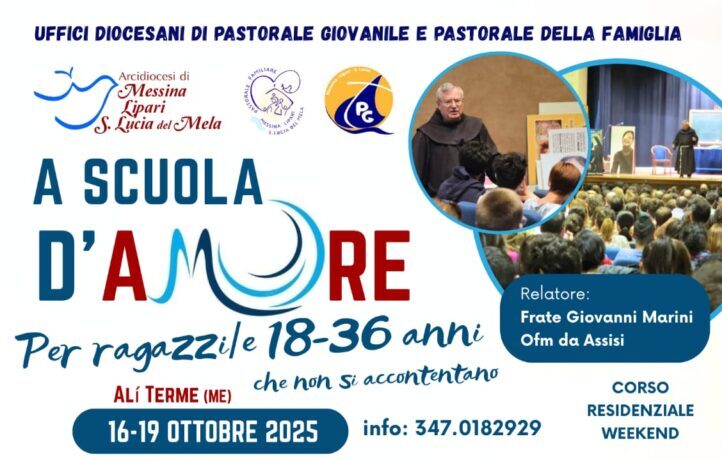 L’Arcidiocesi di Messina invita tutti a partecipare al corso vocazionale-fidanzati sull’amore umano alla luce di Dio, che si terrà per la prima volta in Sicilia, dal 16 al 19 ottobre 2025 presso la Casa di Accoglienza Salesiana “Stella Maris” di Alì Terme (ME).