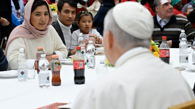 Una giovane suora allatta con un biberon un neonato di colore. Lei, Missionaria della Carità , povera tra i più poveri del mondo, indugia sul suo piatto di lasagne con verdure perché prioritario è nutrire il piccolo. In Aula Paolo VI è una festa sulle note della tradizione melodica napoletana eseguita dal vivo dalla piccola orchestra di Forcella ad allietare il convivio nella IX Giornata mondiale dei Poveri. Il Papa, arrivato dopo la recita dell’Angelus in San Pietro, prende posto nella tavolata allestita al centro in prossimità del palco e condivide qualche parola di benvenuto:  Con grande gioia ci raduniamo in questo pomeriggio per questo pranzo, in questa Giornata che tanto ha voluto il nostro tanto amato, il mio predecessore, Papa Francesco. Un forte applauso per il Papa Francesco.