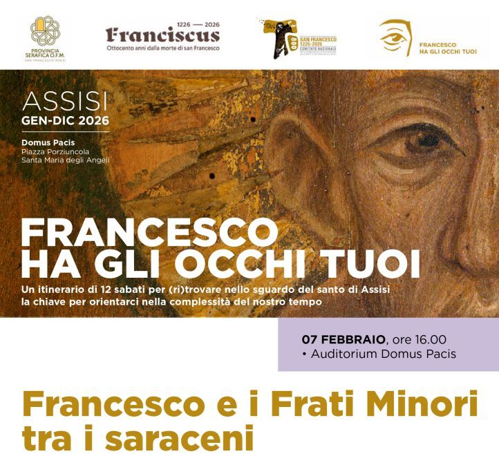 La rassegna “Francesco ha gli occhi tuoi” prosegue con un secondo incontro sabato 7 febbraio – presso la Domus Pacis di Santa Maria degli Angeli, a pochi passi dalla Porziuncola – dove sul tema “Francesco e i Frati Minori tra i saraceni”, interverranno mons. Paolo Martinelli, Vicario Apostolico dell’Arabia Meridionale, nel ruolo di storico e il card. Pierbattista Pizzaballa, Patriarca di Gerusalemme dei Latini.