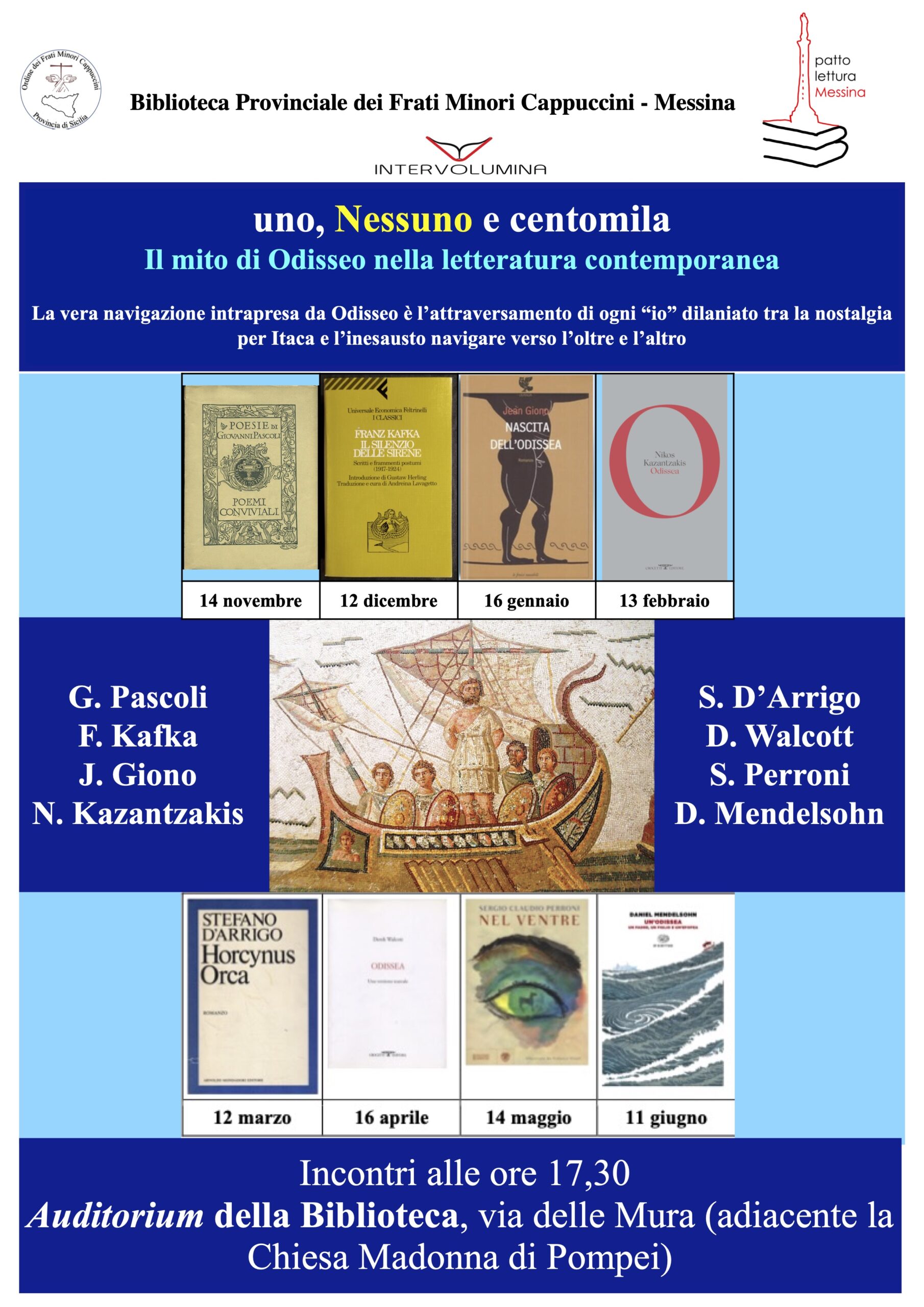 Dal 14 novembre 2023 all’11 giugno 2024, presso la Biblioteca Provinciale dei Frati Cappuccini di Messina si terranno otto incontri sul tema “Uno, Nessuno e centomila. Il mito di Odissea nella letteratura contemporanea”. La vera navigazione intrapresa da Odisseo è l’attraversamento di ogni “io” dilaniato tra la nostalgia per Itaca e l’inesausto navigare verso l’oltre e l’altro.