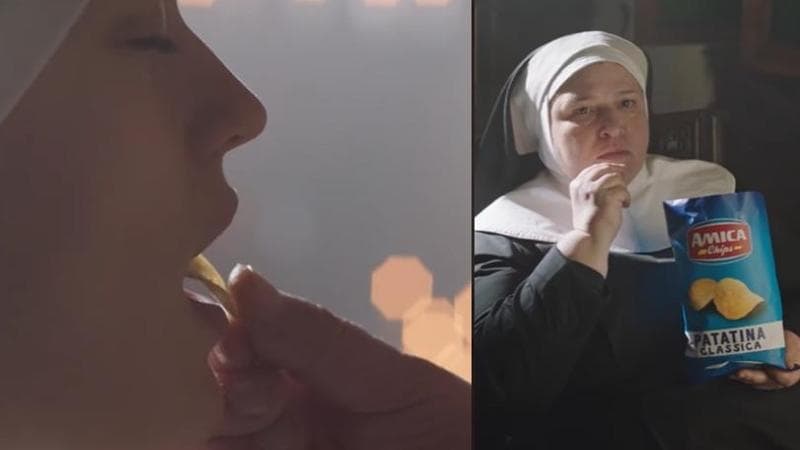 Lo Iap ricorda in un comunicato che «la campagna pubblicitaria, ambientata in un convento e con sottofondo musicale l’Ave Maria di Schubert, mostra un gruppo di suore novizie dirigersi verso l’altare della chiesa per prendere la comunione. Non appena la prima novizia della fila riceve dal sacerdote l’ostia (nella versione web una patatina) si sente un sonoro scrocchio riecheggiare nella chiesa. Stupita e imbarazzata di poter essere la causa di quell’imprevista emissione, la novizia si volta verso la sagrestia dove una altra suora sta sgranocchiando le croccanti patatine pubblicizzate, prendendole dal sacchetto. Il video si conclude con le immagini del prodotto e il claim “Amica chips il divino quotidiano”».