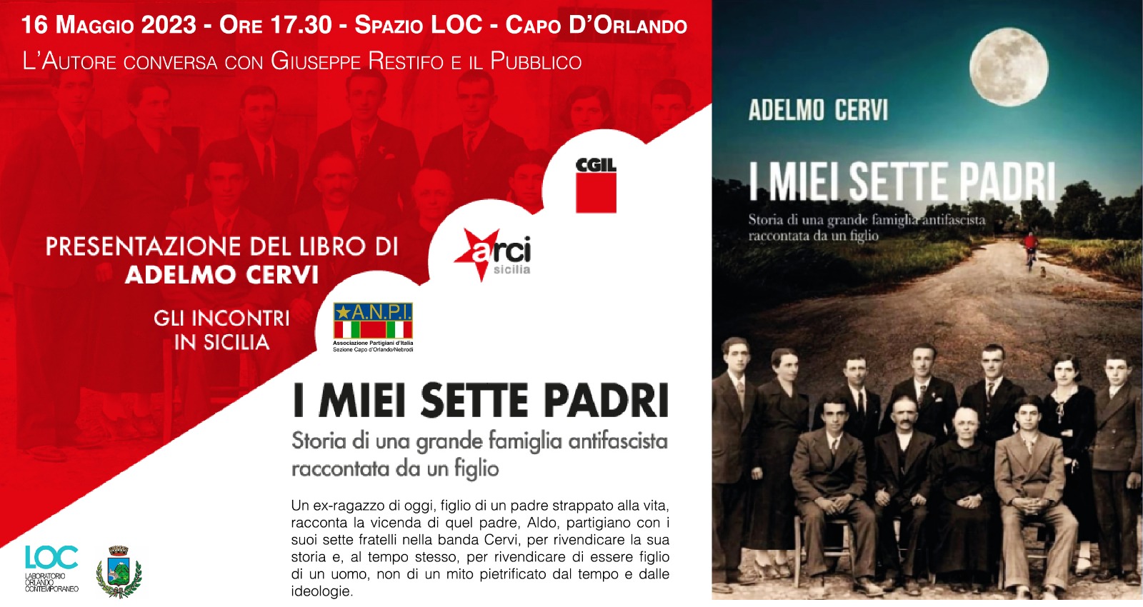 Oggi Martedì 16 maggio, alle 17.30, presso lo spazio LOC di Via del Fanciullo a Capo d’Orlando sarà presentato il libro di Adelmo Cervi “I miei sette padri”. L’evento è organizzato dalla sezione di Capo d’Orlando dell’ANPI con l’ARCI Sicilia e la CGIL.