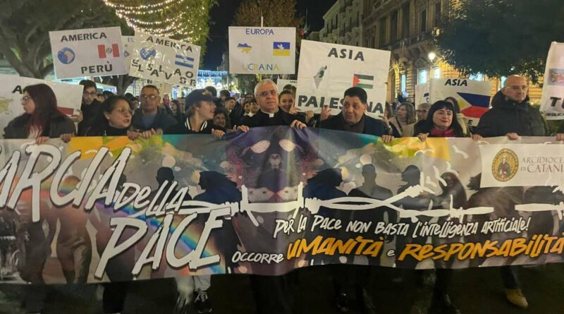 L’iniziativa, ispirata dal messaggio di Papa Francesco sul tema “Intelligenza artificiale e pace”, ha preso il via dalla chiesa di sant’Agata al Borgo e si è snodata per via Etnea fino a Piazza Duomo.