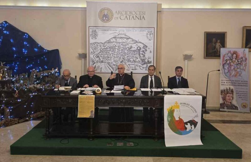 «L’uomo contemporaneo ascolta più volentieri i testimoni che i maestri». Con questa frase di Paolo VI l’arcivescovo Luigi Renna ha aperto stamattina in Arcivescovado la conferenza stampa di presentazione del Giubileo agatino 2025-2026, nel 900° anniversario del ritorno delle reliquie di Sant’Agata da Costantinopoli (1126-2026). Un anno giubilare che non sarà solo festa, ma un richiamo forte alla responsabilità personale e comunitaria. Sant’Agata, ha detto il presule, non va ridotta a icona femminista o a vittima da postare sui social: «Se fosse stata solo questo, nove secoli fa nessuno avrebbe rischiato la vita per riportarne il corpo a Catania». Le reliquie non sono «il cadavere di una defunta», ma «segno di una comunione viva con i santi».