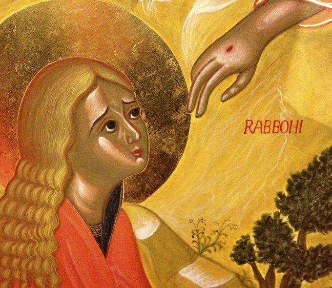 “Maria stava all’esterno vicino al sepolcro e piangeva” (Gv 20,11-18). Pietro e Giovanni, visto il sepolcro vuoto, se ne tornarono di nuovo a casa” (Gv 20,10). Maria rimane: non si scosta da quel “sepolcro vuoto”. Vivo o morto, vuole trovare il corpo del suo Maestro e Signore. Piange Maria: chiusa nel suo dolore, non le bastano le parole degli Angeli: “Perché cerchi tra i morti colui che è vivo? Non è qui, è risorto” (Lc 24,5-6). Essi la invitano ad elevare il suo sguardo: non bisogna cercare il Vivente tra i morti, rafforzano la sua fede e la preparano a ricevere la gioia profonda della presenza del Signore Risorto. Cerca il suo Maestro morto, ma lo desidera vivo; la speranza non è morta nel suo cuore: il Figlio dell’uomo dovrà molto soffrire, ma il terzo giorno risusciterà (Mt 20,18-19); anzi, egli “ha il potere di dare la sua vita e di riprenderla” (Gv 10,17-18). “Donna, chi cerchi?”: di sicuro avrebbe potuto rispondere: “l’amore dell’anima mia” (Cant 3,1), ma il cuore in subbuglio teme l’illusione. “Maria”: riconosce subito la voce del suo Maestro e Signore: “Le mie pecore ascoltano la mia voce e io le conosco ed esse mi seguono. Io do loro la vita eterna e non andranno perdute in eterno e nessuno le strapperà dalla mia mano” (Gv 10,27-28). “Rabbunì”: il rapporto personale, intimo e coinvolgente con il Signore è ripristinato. La sua voce risuona nel cuore: la fede si rafforza, la speranza si proietta nel futuro di un incontro senza fine, l’amore si trasforma in testimonianza: “Maria di Màgdala andò ad annunciare ai discepoli: Ho visto il Signore!”. Apostola degli Apostoli, Maria con la forza del suo amore corre per comunicare la sua certezza di fede, che è anche la certezza di tutti i credenti: “Cristo è risorto dai morti! Veramente è risorto!”.