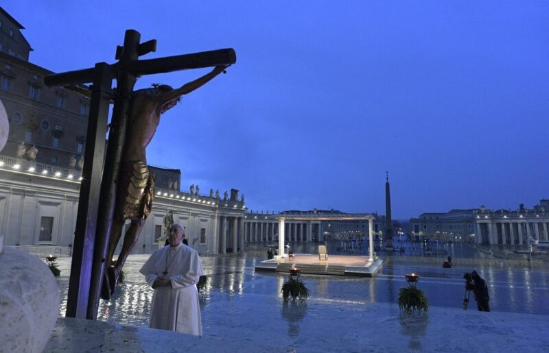 L’immagine del Papa in questa piazza vuota davanti al crocefisso è effettivamente un’icona di quel momento. L’abbiamo visto tutti in televisione, nelle foto, sui giornali. Senza ombra di dubbio quella situazione era in grado di rispecchiare i sentimenti di tutti e ho trovato che quell’immagine fosse effettivamente la trasposizione di quello che mi sentivo dentro, cioè il bisogno di trovare un interlocutore e di trovarlo nel Crocifisso, di dialogare con qualcuno che comprendesse la sofferenza, l’esperienza della sofferenza e della morte che avevamo tutto attorno, che stavamo tutti quanti attraversando, perché certo c’è la sofferenza della malattia e della morte di chi la vive in prima persona, ma poi anche di chi incrocia le persone in lutto. Ecco, il Papa che in mezzo alla piazza vuota dialoga con il Crocifisso è effettivamente in grado di esprimere il momento che attraversavamo, questo bisogno di trovare un dialogo, un interlocutore che è anche l’espressione della speranza.