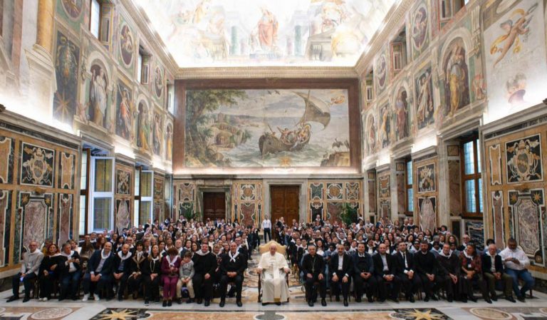 Il Pontefice ha voluto salutare singolarmente tutti i trecento fedeli dando un abbraccio particolare ai poveri ed ai bambini. Un momento particolare ed emozionante. “Siete venuti qui come una grande famiglia, in cui ciascuno ha doni e mansioni diverse e complementari – afferma nel suo discorso il successore di San Pietro- e questa ricca varietà racconta da sé il cammino attraverso cui, in questi anni, avete sviluppato un progetto di bene articolato e concreto. Partendo da situazioni di disagio, avete cercato di abbracciare nella carità tutte le persone e tutta la persona, facendo fronte a molteplici esigenze e promuovendo varie iniziative: dalla mensa quotidiana per i poveri ai laboratori artigianali, dai servizi di recupero scolastico agli spazi di dialogo per famiglie in difficoltà. Si vede che c’è movimento lì, e questo è bello; si vede che vi siete lasciati provocare e inquietare dai bisogni dei fratelli e delle sorelle che Dio ha posto sul vostro cammino, specialmente degli ultimi, dei più bisognosi”.