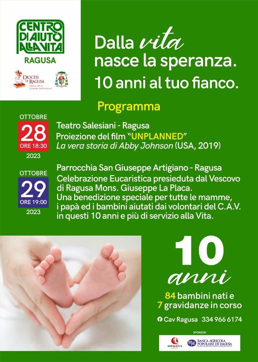 Due gli appuntamenti che scandiranno la celebrazione del decennale. Sabato 28, alle 18.30, al cine teatro Don Bosco di Ragusa sarà proiettato il film “Unplanned, la vera storia di Abby Jonhson”. Racconta la storia di una donna che che da direttrice di una clinica abortista diventa fervente attivista pro life. Domenica 29, alle 19, nella parrocchia di San Giuseppe Artigiano, il vescovo monsignor Giuseppe La Placa celebrerà una santa messa durante la quale si pregherà in particolare per le mamme in attesa e per i bambini che portano in grembo. Sono stati invitati a partecipare gli 84 bambini (qualcuno già adolescente) strappati con soddisfazione loro e delle loro famiglie all’aborto (altre sette gravidanze che dovevano interrompersi sono attualmente in corso).