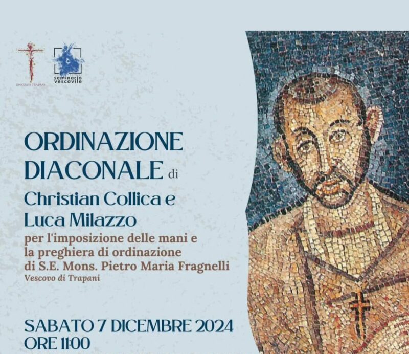 Domani Sabato 7 dicembre, per l’imposizione delle mani e la preghiera di ordinazione del vescovo di Trapani Pietro Maria Fragnelli, saranno ordinati due nuovi diaconi. Si tratta dei seminaristi Cristhian Collica, 26 anni, di Trapani, e Luca Milazzo, 28 anni, di Alcamo.