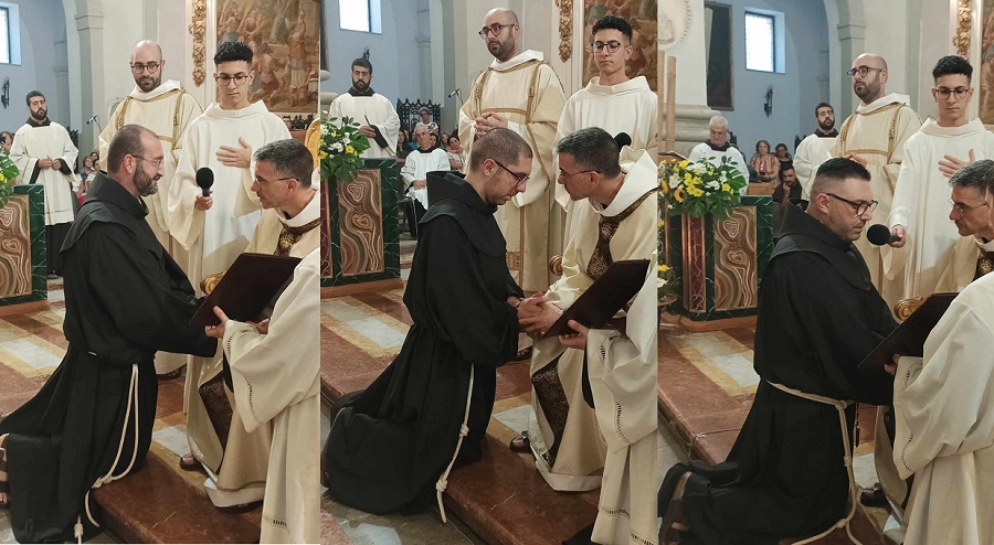 di FraPèA lode e gloria della Santissima Trinità […] con fede salda e volontà decisa: faccio voto a Dio Padre santo e onnipotente di vivere per tutto il tempo della mia vita in obbedienza, senza nulla di proprio (per il TOR: in povertà) e in castità e insieme professo la vita e la Regola dei Frati Minori confermata da papa Onorio promettendo di osservarla fedelmente secondo le Costituzioni dell’Ordine dei Frati Minori”. Così ieri preso la Chiesa di Santa Maria degli Angeli “La Gancia” di Palermo, Fra Francesco Antonio Maria Fiorentino, Fra Gabriele Emanuel Di Gregorio e Fra Davide Antonio Giovanni Pintabona hanno pronunciato il loro Si definitivo al Signore con la Professione Perpetua.