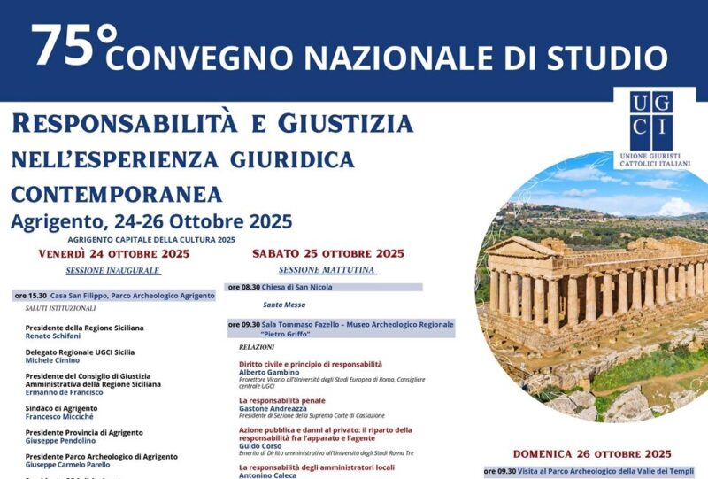 Si apre venerdì 24 ottobre nella Casa San Filippo – Parco Archeologico di Agrigento il settantacinquesimo Convegno Nazionale di Studio dell’Unione Giuristi Cattolici Italiani (Ugci), sul tema “Responsabilità e giustizia nell’esperienza giuridica contemporanea”.