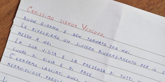 Carissimo signor Vescovo, buon pomeriggio e bentornato tra noi. Le rivolgiamo un sincero ringraziamento per il suo ritorno in mezzo a noi. La sua visita e la presenza di tutti voi ci riempie il cuore di gioia e di pace. C’eravamo lasciati quel giovedì 20 ottobre con quelle sue meravigliose parole, invitandoci a dirle spesso: grazie e scusa. Il suo invito a farle nostre e usarle sempre nella nostra vita quotidiana, per mettere ordine in ciò che Dio con amore ci ha donato il prezioso dono della vita!