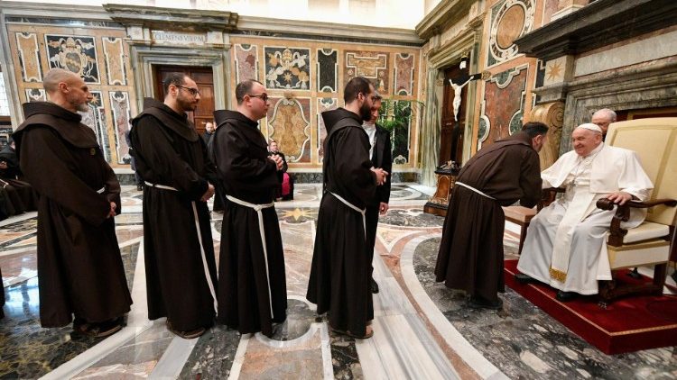 È un Papa come sempre in vena di battute simpatiche quello che ha incontrato la Comunità dei Frati Minori di La Verna e della provincia toscana. Nella mia patria, in Argentina, ha raccontato, «ci sono dei mangiapreti che quando arriva un prete toccano ferro, perché porta jella, ma mai, mai si fa questo con l’abito francescano! È curioso. Mai è insultato un francescano. Perché, non si sa». O probabilmente questo si spiega con il fatto che «il vostro abito fa pensare a san Francesco e alle grazie ricevute. Andate avanti così, e non importa – aggiunge il Pontefice – se sotto l’abito c’è il blue jeans, non c’è problema, ma andate avanti!». L’aneddoto fa parte del discorso pronunciato durante l’udienza vaticana per l’ottavo centenario del dono delle stimmate, ricevute da san Francesco d’Assisi il 14 settembre 1224. Stimmate che richiamano il dovere dei cristiani di «rivolgersi in modo speciale ai “segnati” dalla vita, che portano le cicatrici di sofferenze e ingiustizie subite o di errori commessi. E in questa missione il santo della Verna è un compagno di cammino, che sostiene e aiuta a non lasciarsi schiacciare da difficoltà, paure e contraddizioni, proprie e altrui. È ciò che Francesco ha fatto ogni giorno, dall’incontro con il lebbroso in poi, dimenticando sé stesso nel dono e nel servizio, arrivando perfino, negli ultimi anni, a “disappropriarsi” – questa parola è chiave – disappropriarsi in un certo senso di ciò a cui aveva dato inizio, aprendosi con coraggio e umiltà a vie nuove, docile al Signore e ai fratelli».