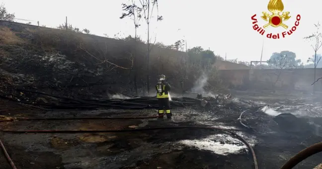 A bruciare oltre alle sterpaglie anche i travertini della linea ferroviaria dismessa.