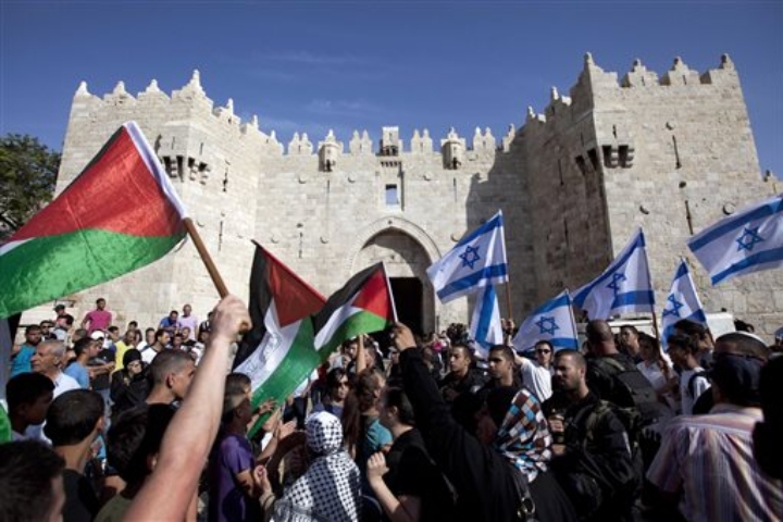FILE - In this May 8, 2013 file photo Israelis and Palestinians wave flags as Israelis march celebrating Jerusalem Day outside Damascus Gate in Jerusalem's old city. Nine months of U.S.-driven diplomacy have left Israelis and Palestinians less hopeful than ever about a comprehensive peace agreement to end their century of conflict. Although a formula may yet be found to somehow prolong the talks past an end-of-April deadline, they are on the brink of collapse and the search is already on for new ideas. (AP Photo/Sebastian Scheiner, File)