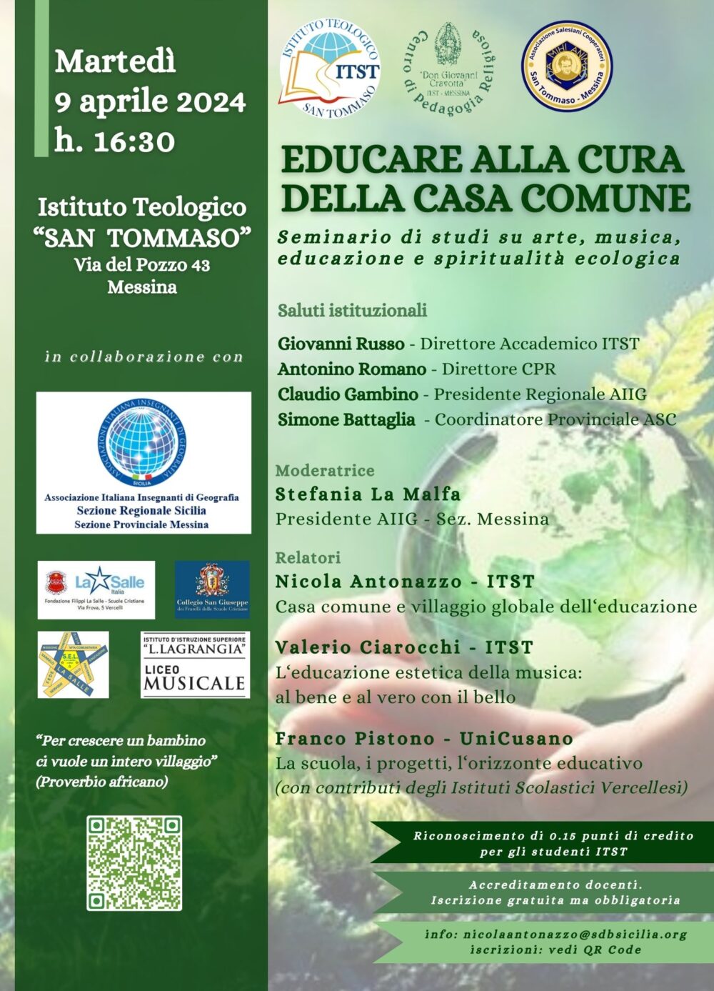 Martedì 9 aprile 2024, alle ore 16:30, presso l’Istituto Teologico San Tommaso di Messina, si svolgerà l’annuale Seminario di Pedagogia che quest’anno pone la sua attenzione sui temi della cura della casa comune. Promotori dell’iniziativa, oltre all’Istituto Teologico (ITST), il Centro di Pedagogia Religiosa “Don Giovanni Cravotta” (CPR) e il Centro Locale dell’Associazione dei Salesiani Cooperatori (ASSCC).