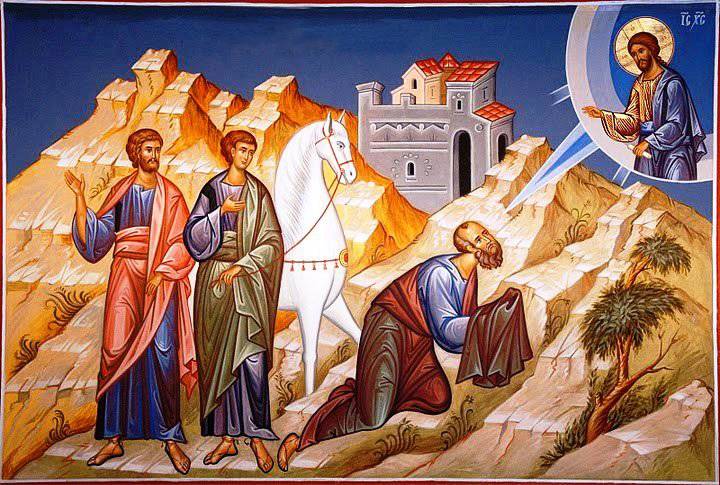 «Saulo frattanto, sempre fremente minaccia e strage contro i discepoli del Signore, si presentò al sommo sacerdote e gli chiese lettere per le sinagoghe di Damasco al fine di essere autorizzato a condurre in catene a Gerusalemme uomini e donne, seguaci della dottrina di Cristo, che avesse trovati. E avvenne che, mentre era in viaggio e stava per avvicinarsi a Damasco, all’improvviso lo avvolse una luce dal cielo e cadendo a terra udì una voce che gli diceva: «Saulo, Saulo, perché mi perseguiti?». Rispose: «Chi sei, o Signore?». E la voce: «Io sono Gesù, che tu perseguiti! Orsù, alzati ed entra nella città e ti sarà detto ciò che devi fare». Gli uomini che facevano il cammino con lui si erano fermati ammutoliti, sentendo la voce ma non vedendo nessuno. Saulo si alzò da terra ma, aperti gli occhi, non vedeva nulla. Così, guidandolo per mano, lo condussero a Damasco, dove rimase tre giorni senza vedere e senza prendere né cibo né bevanda»