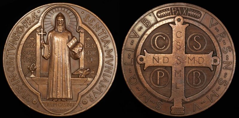 Può essere utile una spiegazione che sia di supporto a quanti vengano in contatto con la “Medaglia di san Benedetto”. Sul retto della medaglia vi è l’immagine di san Benedetto con la croce nella mano destra. Nella mano sinistra tiene invece la sua Regola, sintetizzabile nel motto “Ora, labora et lege – Prega, lavora e leggi”.