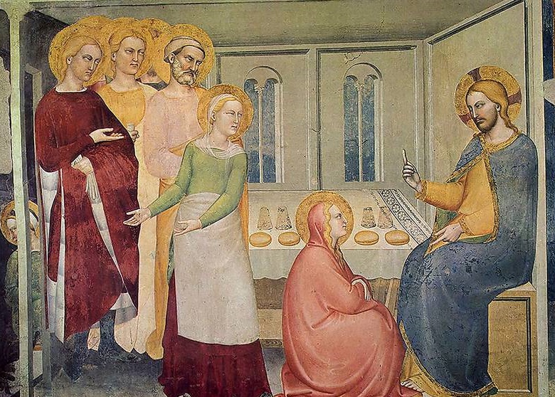 “Maria, seduta ai piedi del Signore, ascoltava la sua parola. Marta invece era distolta per i molti servizi” (Lc 10,38-42). Due persone: immagini dell’azione e della contemplazione, dell’amore a Dio e al prossimo. Non vanno disgiunte né contrapposte. L’amore a Dio è il fondamento dell’amore al prossimo, l’amore al prossimo si basa sul comandamento di Gesù: “Ama-tevi come io vi ho amato” (Gv 15,12.17).