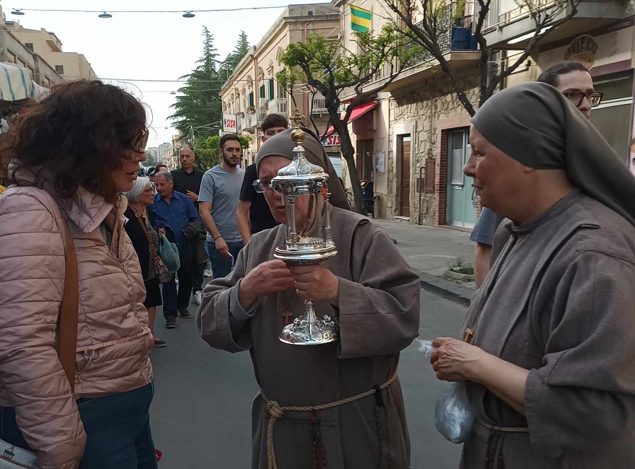 Significativo è stato il passaggio della reliquia nella Fiera annuale che si svolge nella via centrale di Enna. Sotto lo sguardo curioso della gente frati e suore hanno attraversato la fiera tra le bancarelle facendo conoscere San Benedetto e pregando con le tante persone che hanno chiesto preghiere per loro e per i loro cari. Un passaggio di Grazia che l’umile Frate di San Fratello ha voluto fare tra la gente così come faceva quando era in vita.