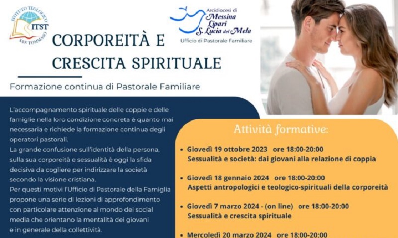 In continuità con il Master Pastorale in Matrimonio e Famiglia, l’ufficio di pastorale della famiglia e la “Fondazione Giovanni Paolo II per la persona la coppia e la famiglia”, insieme all’Istituto Teologico S. Tommaso, propongono un approfondimento sul tema della corporeità, personale e di coppia, nella sua dimensione sessuale e spirituale.