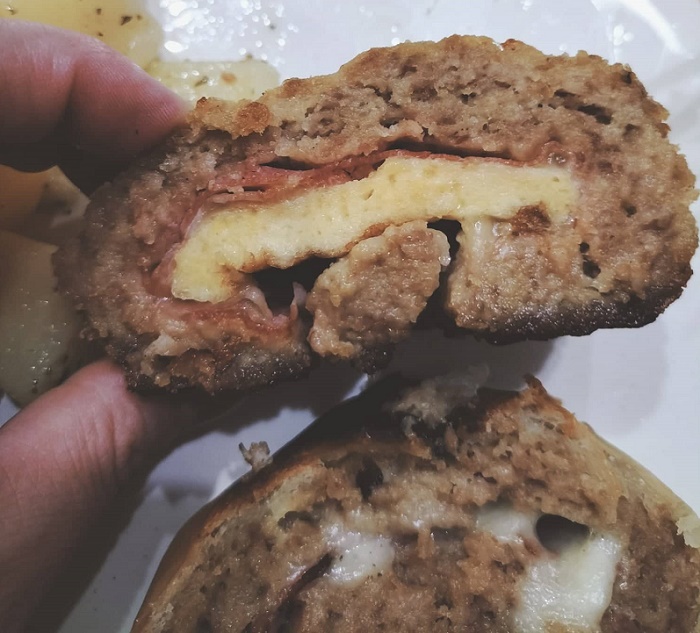 È ottimo perché puoi anche cucinarlo prima. È un impasto di carne trita uova e formaggio ripieno con frittatina di uova salumi e formaggio. È proprio un piatto da condividere che mette d’accordo tutti, grandi e piccini.