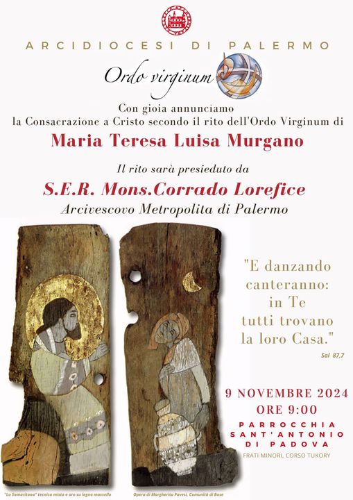 Una nuova consacrata nell’Ordo Virginum dell’Arcidiocesi di Palermo. Il rito di consacrazione sarà presieduto dall’Arcivescovo Mons. Corrado Lorefice sabato 9 novembre alle ore 9.00 nella Parrocchia Sant’Antonino retta dai Frati Minori, nei pressi della Stazione Centrale del Capoluogo