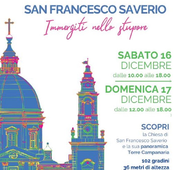 A partire da sabato 16 dicembre, dalle ore 10.00, e a seguire per tutti i week end da venerdì a domenica, la Torre Campanaria della Chiesa di San Francesco Saverio sarà aperta al pubblico attraverso un percorso guidato, ed in sicurezza, che condurrà i visitatori in un viaggio unico ed emozionante alla scoperta di questo gioiello tardo-barocco nel cuore del quartiere Albergheria di Palermo fino alla sommità della sua torre.