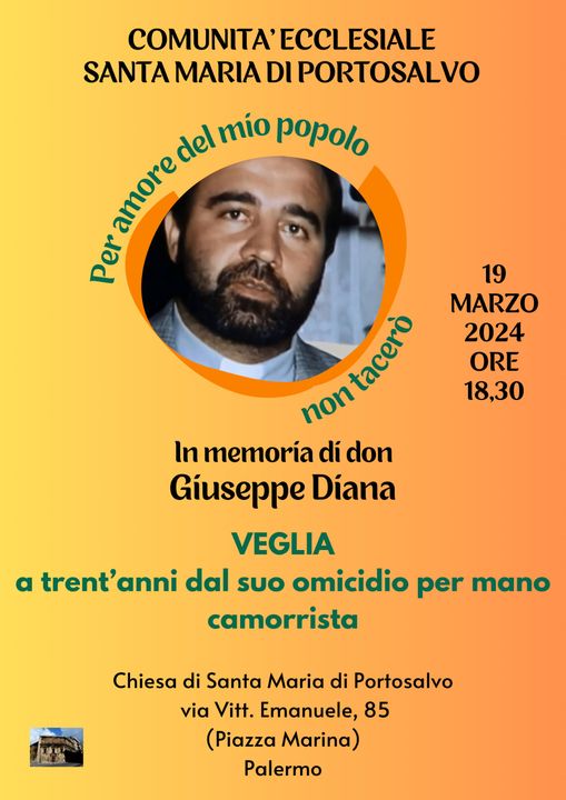 A trent’anni dall’omicidio per mano della camorra di don Giuseppe Diana, parroco di Casal di Principe, la Comunità ecclesiale di Santa Maria di Porto Salvo organizza il 19 marzo alle ore 18,30 nella chiesa in via Vittorio Emanuele n.85 (Piazza Marina) una veglia in memoria di don Peppe Diana.