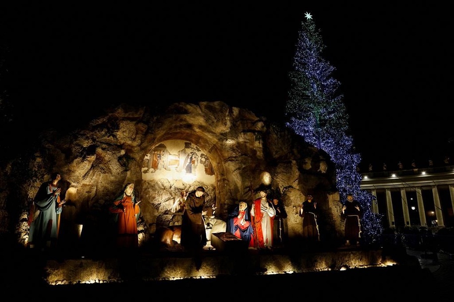 Squarci di cielo tra le nuvole, mentre su piazza San Pietro calano le ombre della sera. E in effetti è uno squarcio di luce che si accende nelle tenebre, anche l’addobbo luminoso dell’albero di Natale giunto fin qui dal Piemonte (diocesi di Saluzzo) e le luci del presepe che quest’anno è stato offerto dalla diocesi di Rieti, nell’800.mo anniversario del primo presepe ideato a Greccio da san Francesco in persona. La scena di quest’anno ha anche l’apporto degli artigiani di Cinecittà. Sono quasi le 18,00 di un sabato pomeriggio freddo, ma il clima si riscalda man mano davanti ai due simboli natalizi per eccellenza. E lo sguardo, dalla piazza al centro della cristianità, si allarga a tutto il mondo, specie là dove la luce del Natale deve fare i conti con la guerra e la sofferenza.
