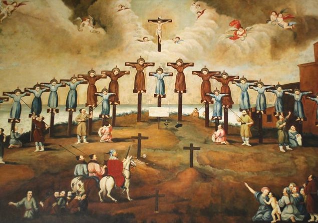 All’inizio del 1597 furono tutti condotti a piedi fino a Nagasaki, nella speranza che gli scherni delle popolazioni li inducessero ad abiurare. Ma, rimanendo fermi e compatti nella loro fede, i 26 prigionieri vennero condannati a morte sulla collina che, in seguito, fu chiamata ‘la collina santa’. Legati mani e piedi, furono issati su croci e trafitti al cuore da un colpo di lancia.
