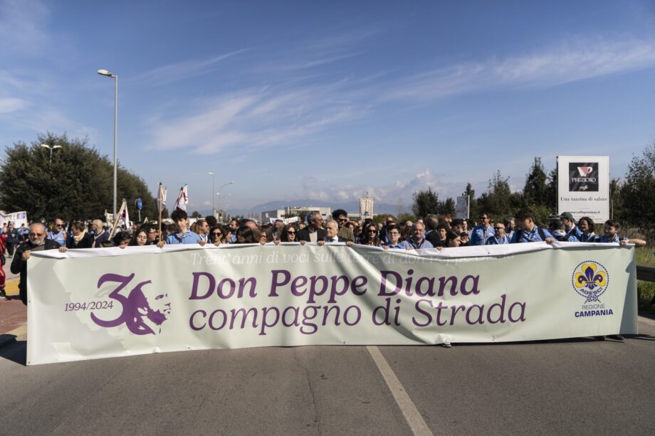 La pista di atletica che circonda il prato dello Stadio Comunale “Angelo Scalzone” di Casal di Principe si riempie di camicie azzurre. Sono circa 7mila gli scout che il 17 marzo sono arrivati da tutt’Italia per celebrare la memoria di don Peppe Diana, sacerdote ucciso dalla camorra all’interno della sua chiesa il 19 marzo 1994. Un unicum in Italia, non esistono infatti altri casi di parroci ammazzati dalle mafie all’interno di una parrocchia. Sono trascorsi 30 anni da quel tragico giorno, ma non c’è stato nessun corteo funebre, piuttosto una festa, proprio nello stile di don Peppe, che scout lo è stato per tutta una vita.