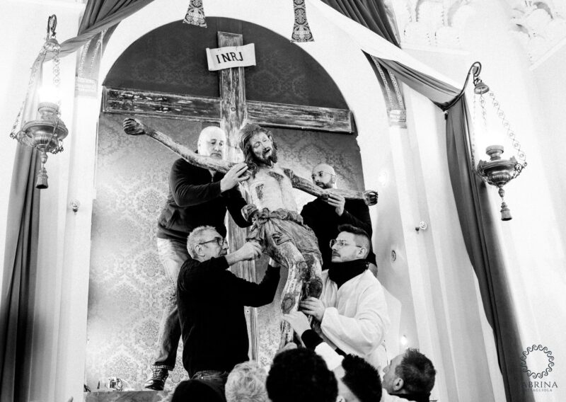 Mercoledì 16 aprile, alle 17.00, nella chiesa di San Pietro, verrà celebrato il rito della “Scinnuta ra Cruci”, con la deposizione dei simulacri del Cristo Crocifisso e della Vergine Addolorata sulle maestose “Varette” processionali.