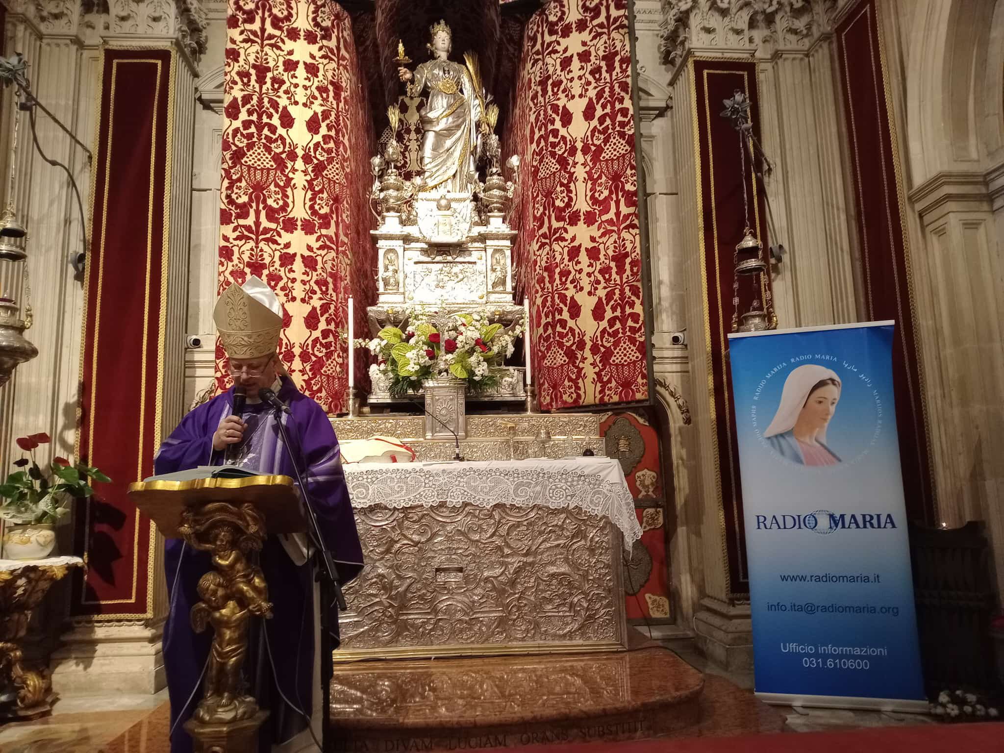Ieri 12 dicembre, vigilia della festa di Santa Lucia, l’Arcivescovo di Siracusa Mons. Francesco Lomanto, ha presieduto la celebrazione eucaristica ‒ preceduta dalla recita del Santo Rosario, con l’integrazione della liturgia delle lodi ‒ nella Cappella Santa Lucia della Chiesa Cattedrale  in diretta con Radio Maria, grazie al fedele servizio di tutti operatori.