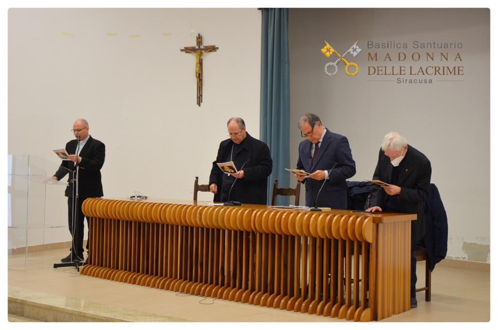 “Dio degli abissi immerge il lettore nella meditazione degli abissi divini e degli “spazi” infiniti dell’insondabile mistero di Dio e del suo amore per gli uomini. Con la viva sensibilità di fede e con il forte rigore scientifico, mons. Giuseppe Greco ‒ tra meditazioni e alcune poesie ‒ presenta ventisei brevi ma intensi saggi sul Dio degli abissi, che riesce ad armonizzare a livello biblico, teologico, spirituale e a presentare in una sequenza significativa per il cammino di fede cristiana, offrendo una direzione di salvezza in un’ampia visione della storia e delle sfide del nostro tempo. Ringraziamo mons. Greco per questo ulteriore libro che arricchisce la nostra riflessione teologica e la nostra vita spirituale, invitandoci ad avanzare nel cammino della fede con uno sguardo contemplativo, per risalire con animo pieno di amore al Dio degli abissi. Il Signore ci doni di compiere e di sperimentare l’abisso del suo infinito amore, anche attraverso le urgenze della storia e le sfide dei tempi“. Lo ha detto l’arcivescovo di Siracusa, mons. Francesco Lomanto, presentando il nuovo libro di Mons. Giuseppe Greco dal titolo “Dio degli abissi”. La copertina del libro, realizzata dal maestro Paolo Scirpa, è stata presentata dallo storico d’arte prof. Paolo Giansiracusa. Ha moderato il rettore del Santuario don Aurelio Russo.