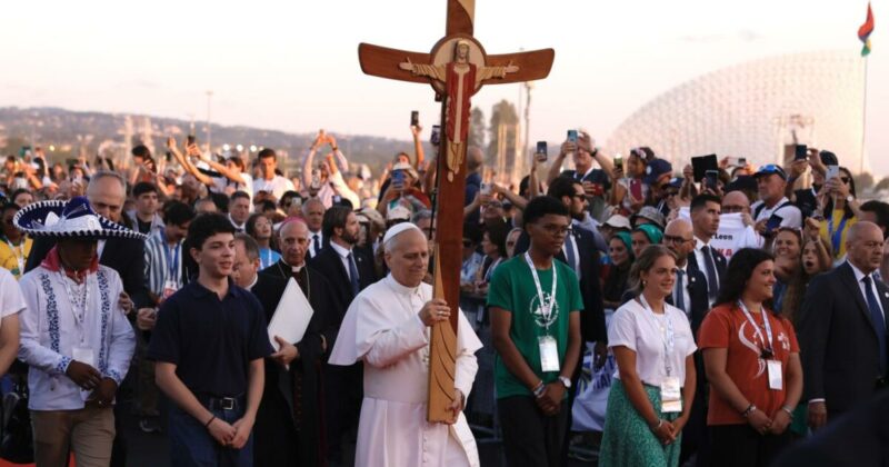 “Cristo è qui”. Lo recitano striscioni la cui scritta si perde tra i mille colori delle bandiere delle nazioni o dei gruppi di appartenenza, tra cui spicca – una della più alte – quella della Corea, meta della prossima Giornata Mondiale della Gioventù 2027. “Siamo 1.078, così ci ritroviamo tutti”, dicono. E qui c’è il Papa: un uomo, quasi settantenne, vestito di bianco, con il sorriso accennato e le mani salde sulla croce di legno, che accompagna la folla in questo momento di Chiesa che stupisce e interroga. Come a Lisbona, nel 2023, quando tutti si domandarono com’era stato possibile, in un’epoca di sentimenti virtuali e apatia reale, radunare un milione e mezzo di ragazzi per un evento religioso.