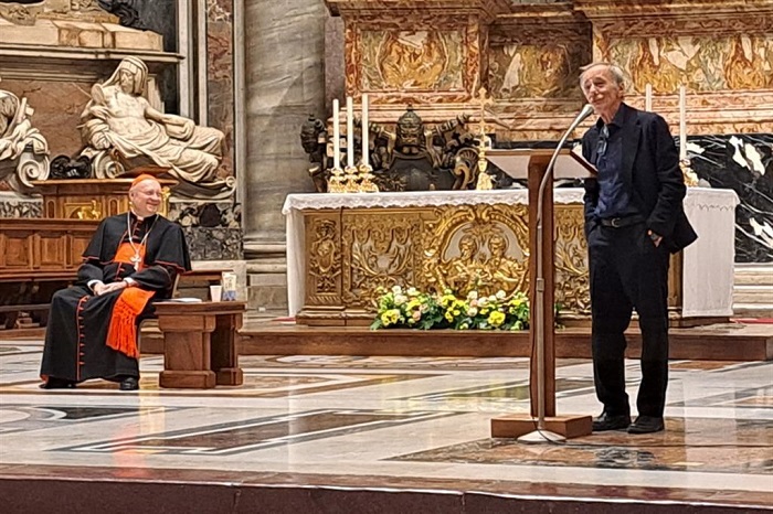 Luci a San Pietro. Roberto Vecchioni ride di gusto alla battuta e a sua volta ribatte: “Qui le luci durano tanto di più. E speriamo durino ancora a lungo”. Il cantautore è stato protagonista ieri sera, 21 novembre, della seconda Lectio Petri nella Basilica Vaticana, insieme con i cardinali Mauro Gambetti (arciprete della Basilica stessa), Gianfranco Ravasi (che ha tenuto la Lectio vera e propria), la storica Emma Fattorini e l’attrice Beatrice Fazi, che ha dato voce da par suo ad alcuni passi degli Atti degli Apostoli, poi commentati da Ravasi.