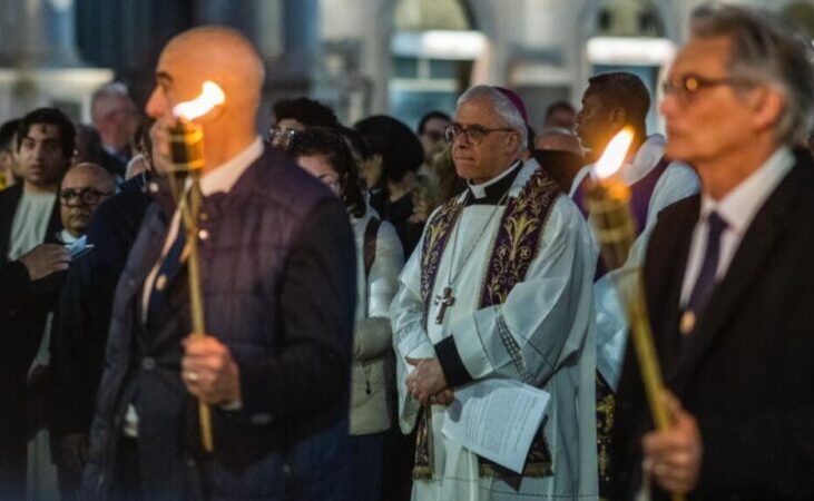 Una folla multicolore, composta da bambini, ragazzi, adulti, anziani, ha percorso la via Etnea a Catania la sera dell’11 aprile pregando e ricordando il dolore della crocifissione di Cristo. Partendo dalla basilica cattedrale e proseguendo fino al sagrato della chiesa di San Biagio in piazza Stesicoro, tra turisti curiosi e cittadini che si godevano il loro aperitivo di un venerdì sera primaverile, si è svolta la “Via Crucis per Catania” guidata dall’arcivescovo Mons. Luigi Renna.